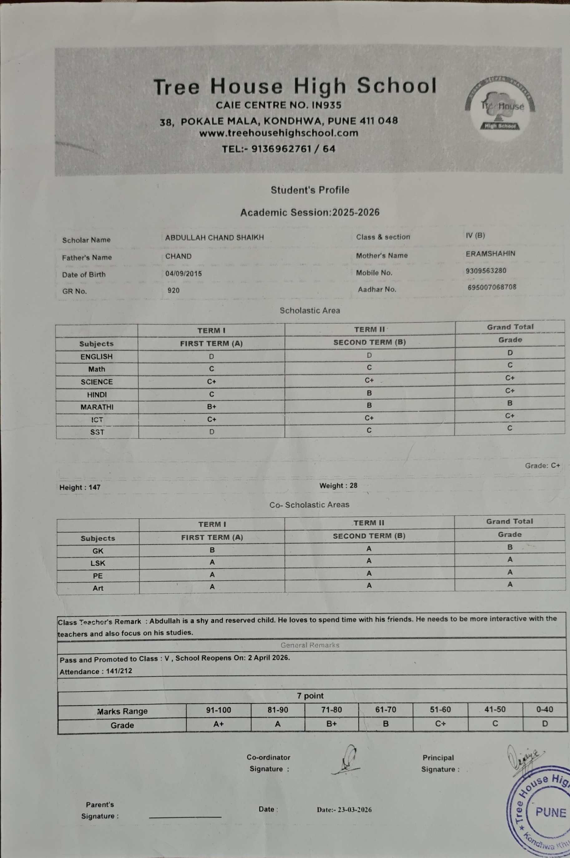 Abdullah Chand Shaikh is a bright young student at Tree House High School (IGCSE Board), Pune. He has successfully completed his 4th-grade studies and has been promoted to Grade 5 for the upcoming 2026-27 academic session. This student was admitted through RTE and hence does not require annual fees. However, his journey toward education is facing a significant roadblock.
